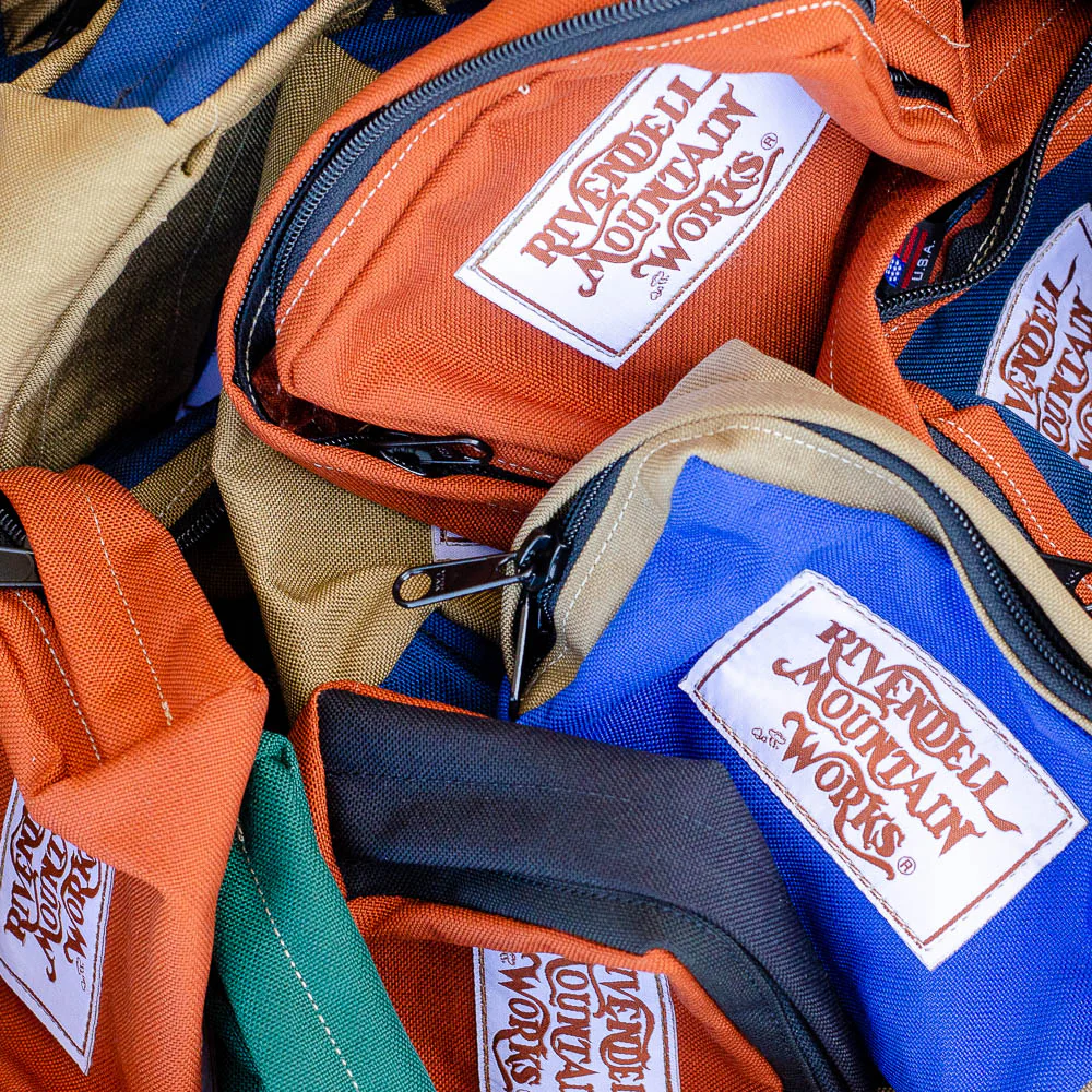Rivendell Mountain Works was started by a guy named Larry Horton, who is now a doctor of Chinese medicine in New Mexico (has been since RMW closed or he sold it in 1979 or so). Since then it was bought by Don Wittenberg, a good lawyer who knew the shame in seeing it go away, so wanted to save it. The day-to-day manager has been Eric Hardee, mountaineer, ski patroller, and full-time sewer. Not all of the original RMW products are still in circulation, but most of the packs are, and the new here, the Elf Pouch, has been my (Grant) and my friends’ and several RIV employee’s favorite bike tool pocket for years now. It fits in any pack, but it usually goes into a BananaSack. It has a beltloop, and has often been a small camera bag. It’s a good size.